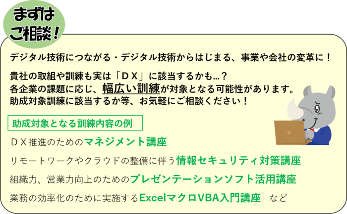 - 中小企業がDXに関する自社内に外部講師を招いて実施する訓練及び民間の教育機関等が提供する集合又はeラーニング等により実施する訓練
